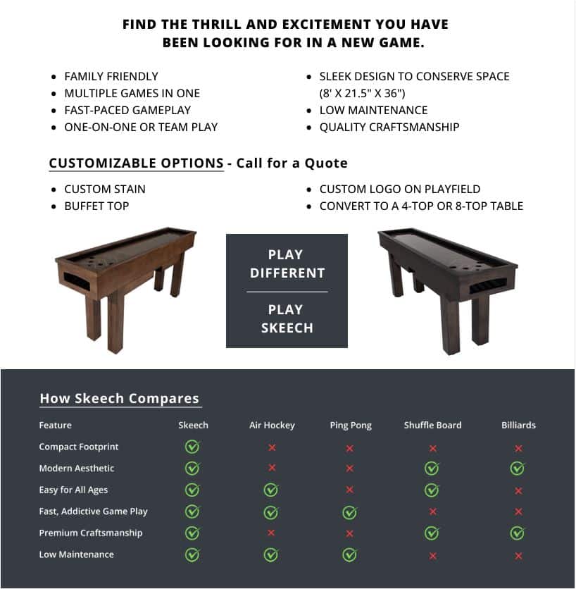 The Original Skeech Table plus a 18″ x 27″ Framed Rules Board. Available in 2 finishes, Jacobean and Ebony.
